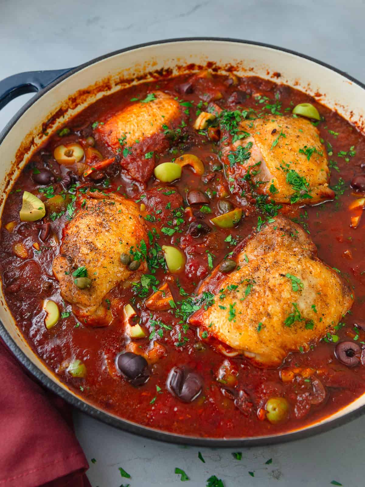 - Finish cooking the chicken: Nestle the chicken thighs back into the sauce, skin-side up, and scatter the capers and chopped olives around the chicken. Reduce the heat to a good simmer and cook uncovered for 18 to 20 minutes, or until the chicken is cooked through and the sauce has slightly thickened.