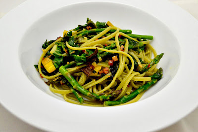 4) When vegetables are done, add pancetta back in the pan and lower the heat.