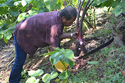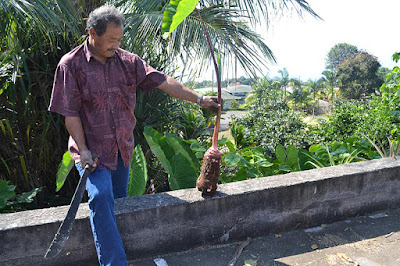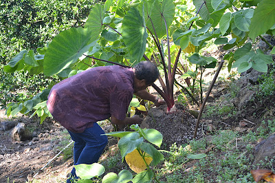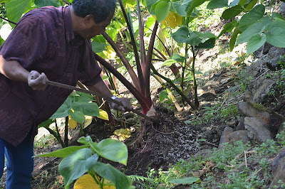 My parents have a beautiful fruitful garden, multiplying with night blooming jasmine, fresh organic lemons, tomatoes, pineapple, passion fruit (AKA lilikoi)...and what we are harvesting today, Purple Taro.