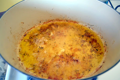 7) Next, beat in the casserole liquid very slowly, a few tablespoons at a time. This will create a thick and gorgeous hollondaise sauce.