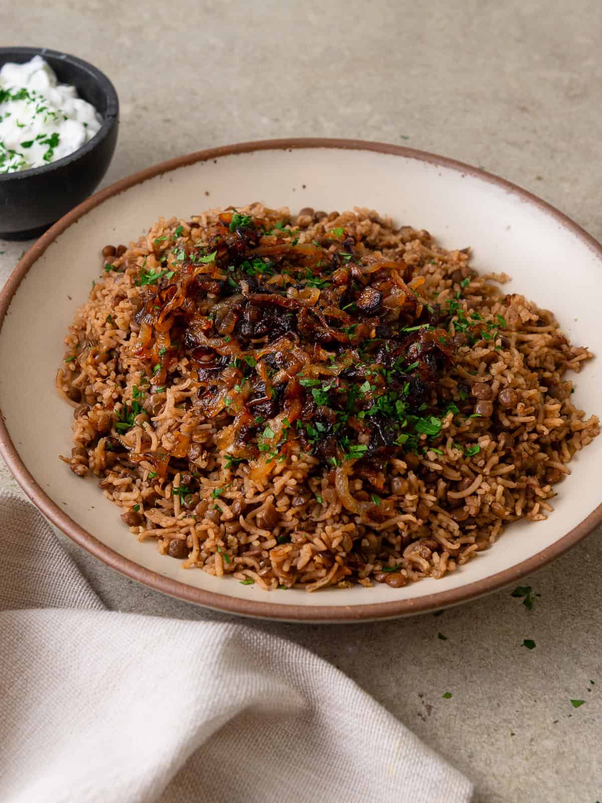 Finish and serve: Once done, fluff the mujadara with a fork and transfer to a serving dish. Top with the remaining caramelized onions and garnish with fresh parsley.