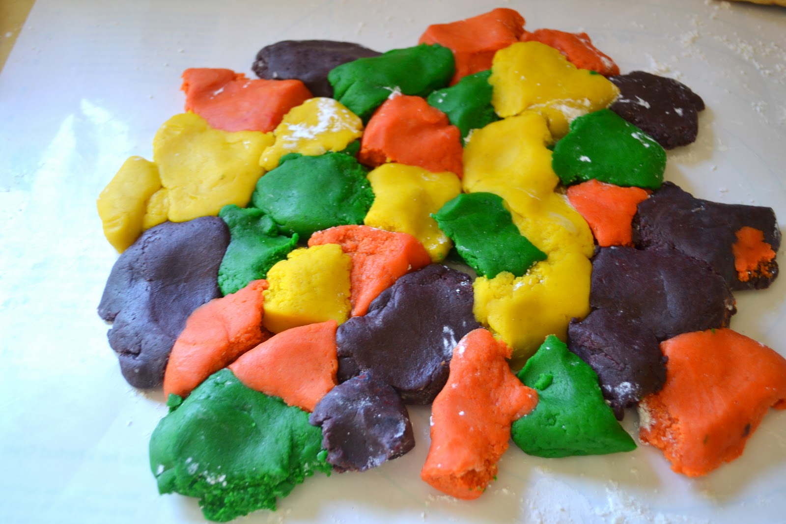 7) Break pieces off of each colored dough and place them next to each other, creating a “patchwork” of color.