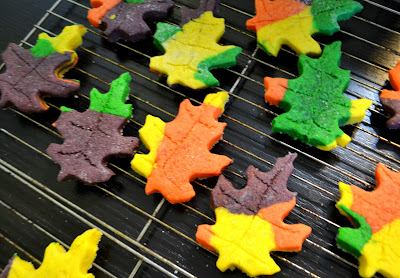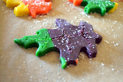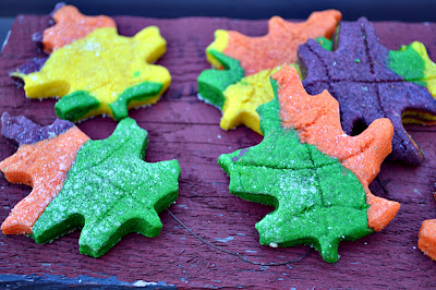Fun and colorful Thanksgiving leaf cookies made with colored sugar cookie dough.